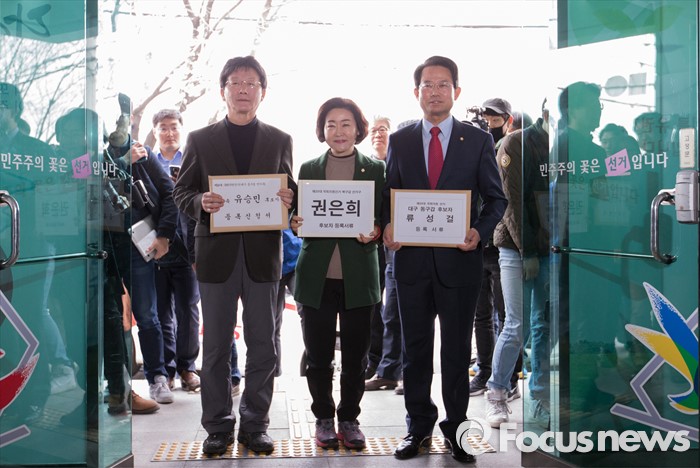 (대구=포커스뉴스) 25일 오전 대구 동구선거관리위원회에서 유승민(왼쪽부터, 대구 동을), 권은희(대구 북갑), 류성걸(대구 동갑) 의원이 후보자 등록에 앞서 기념촬영을 하고 있다.