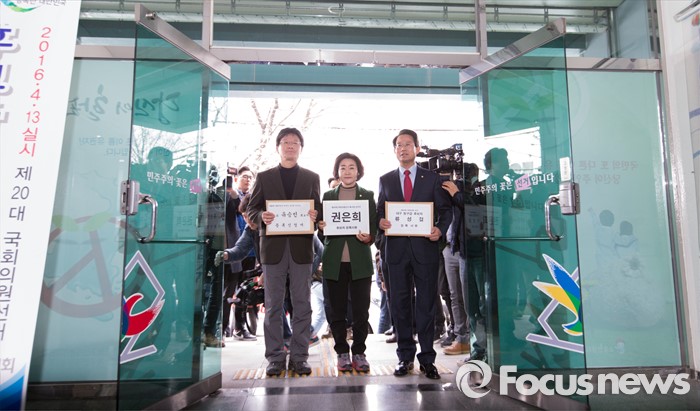 (대구=포커스뉴스) 25일 오전 대구 동구선거관리위원회에서 유승민(왼쪽부터, 대구 동을), 권은희(대구 북갑), 류성걸(대구 동갑) 의원이 후보자 등록에 앞서 기념촬영을 하고 있다.