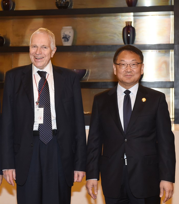 (서울=포커스뉴스) 2016년 보아오 포럼 연차총회 참석차 중국 하이난을 방문중인 유일호 부총리 겸 기획재정부 장관이 24일 BFA ICC에서 에드먼드 펠프스 컬럼비아대 교수와 면담에 앞서 기념촬영을 하고 있다. <사진제공=기획재정부>