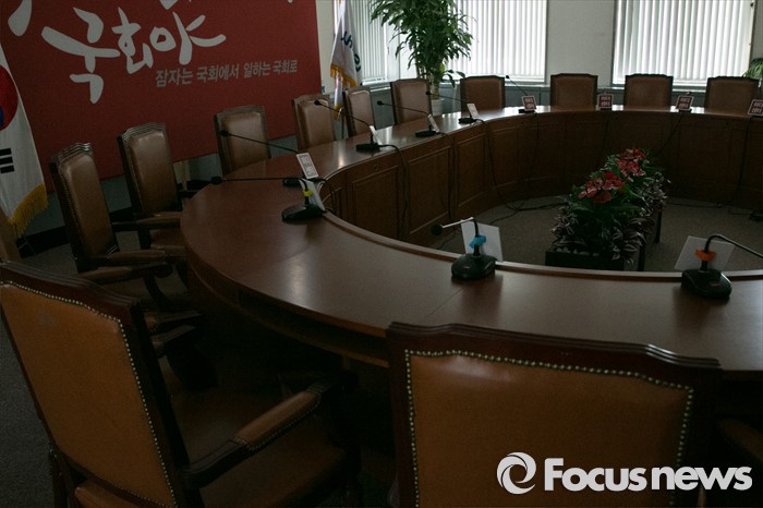 (서울=포커스뉴스) 25일 오전 서울 여의도 국회 새누리당 대표최고위원회의실에 불이 꺼져 있다. 이날 새누리당 최고위원회는 원유철 원내대표를 비롯한 최고위원들의 긴급 최고위원회 소집 요구로 국회 대표최고위원실에서 열릴 예정이었으나, 예정된 시간을 훌쩍 넘겨 당사 회의실에서 비공개로 열리게 되었다.