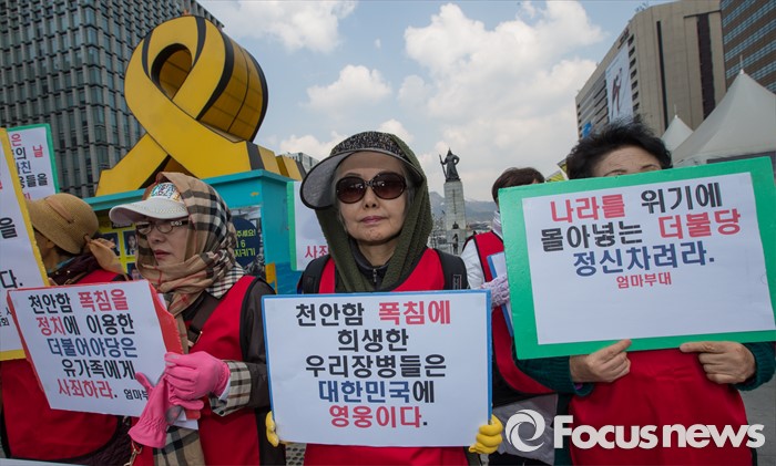 (서울=포커스뉴스) 25일 오전 서울 광화문광장에서 열린 천안함 6주기 추모 및 북한 규탄 기자회견에 참석한 엄마부대봉사단 회원들이 천안함 희생 장병들을 기리는 손팻말을 들고 있다.
