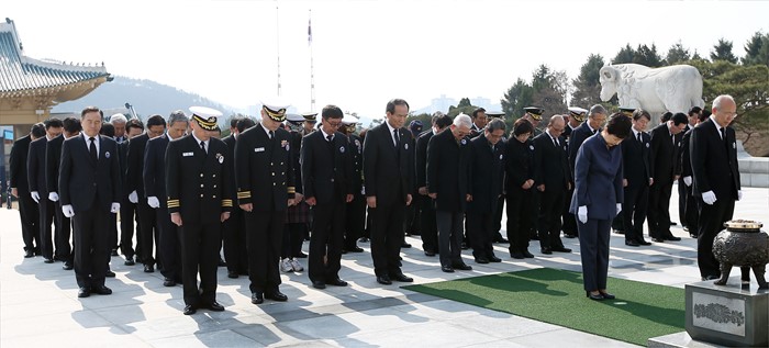 (서울=포커스뉴스) 박근혜 대통령이 25일 오전 국립대전현충원에서 열린 1회 서해수호의 날 기념식에 참석해 헌화 및 분향 후 묵념을 하고 있다. <사진제공=국가보훈처>