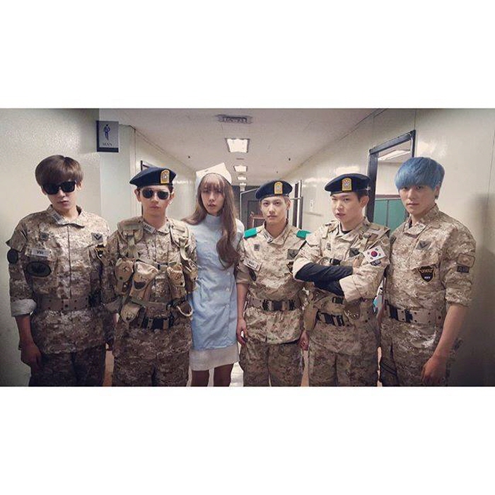 에디(Eddy)가 달달한 매력으로 대한민국 여심을 자극하는 유시진 대위(송중기 분)를, 모델출신답게 여성 못지않은 각선미를 자랑하는 이코(E.co)가 미모의 여의사 강모연(송혜교 분)을 연상케 하는 간호사 복장을 착용해 이색 케미를 연출했다. 다른 멤버들 역시 특전사 의상으로 늠름한 남성미를 발산해내며 시선을 사로잡았다.