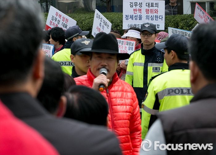 (서울=포커스뉴스) 김무성 새누리당 대표가 당 공천관리위원회의 결정에 반발해 유승민 의원 등 지역구 6곳에 대해 무공천을 선언해 갈등이 이어지고 있는 25일 오후 서울 여의도 당사 앞에서 김 대표의 결정에 반대하는 시민단체와 김 대표 지지자들이 각각 집회를 하고 있다.