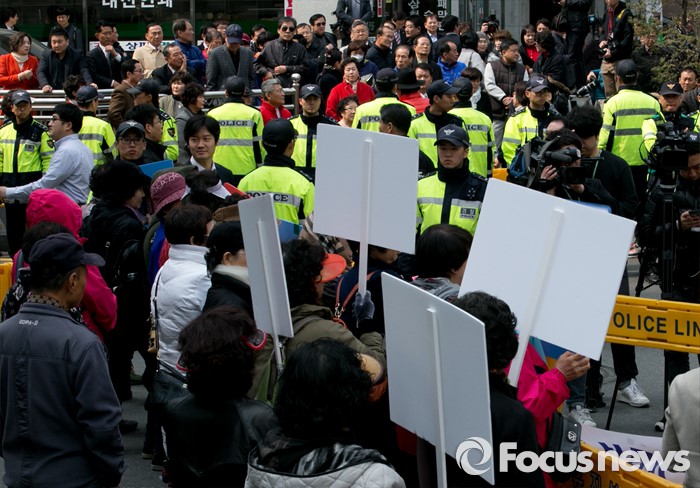 (서울=포커스뉴스) 김무성 새누리당 대표가 당 공천관리위원회의 결정에 반발해 유승민 의원 등 지역구 6곳에 대해 무공천을 선언해 갈등이 이어지고 있는 25일 오후 서울 여의도 당사 앞에서 김 대표의 결정에 반대하는 시민단체와 김 대표 지지자들이 각각 집회를 하고 있다.