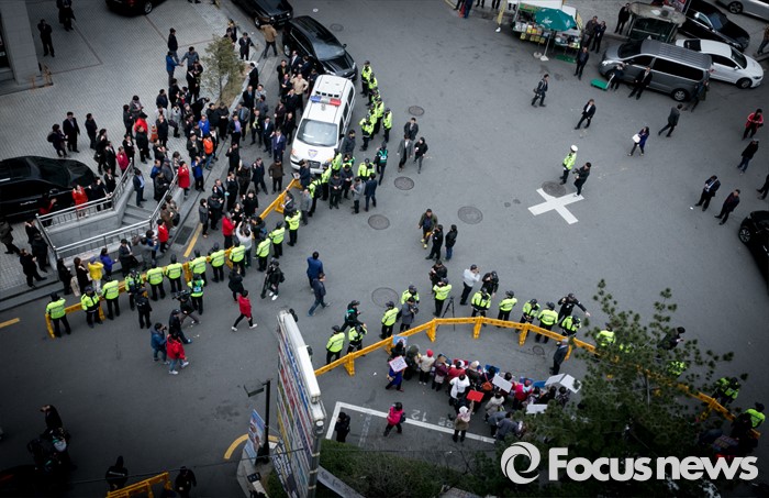 (서울=포커스뉴스) 김무성 새누리당 대표가 당 공천관리위원회의 결정에 반발해 유승민 의원 등 지역구 6곳에 대해 무공천을 선언해 갈등이 이어지고 있는 25일 오후 서울 여의도 당사 앞에서 김 대표의 결정에 반대하는 시민단체와 김 대표 지지자들이 각각 집회를 하고 있다.