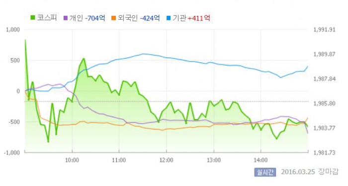 이날 코스피는 1990선에서 상승 출발했다. 그러나 지수는 개인과 외국인의 동반 팔자세에 1980선에서 장중 내내 등락을 반복했다.