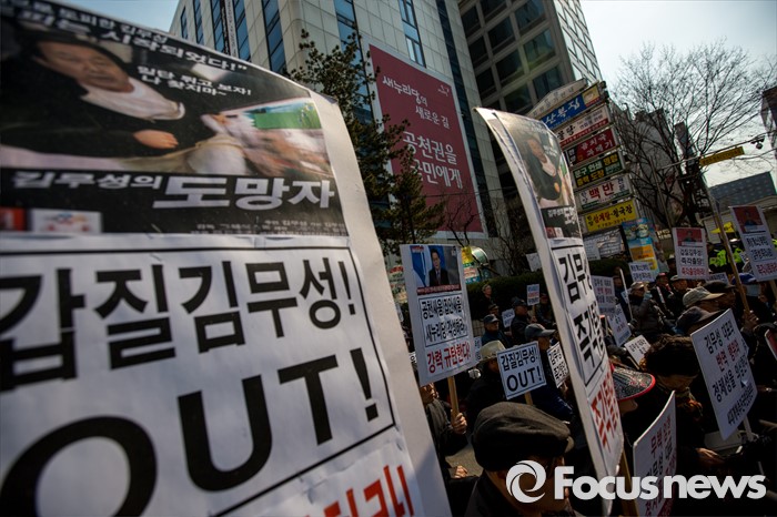 (서울=포커스뉴스) 새누리당이 최고위원회의를 열어 의결이 보류된 5개 지역구에 대한 추인 문제를 논의하고 있는 25일 오후 서울 영등포구 새누리당사 앞에서 어버이연합 관계자들이 '옥새투쟁'을 이어가고 있는 김무성 새누리당 대표의 행동을 규탄 하고 있다.