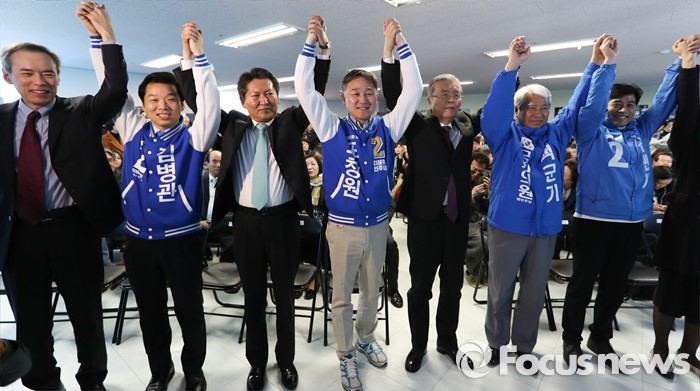(용인=포커스뉴스) 김종인 더불어민주당 비대위 대표가 25일 오후 경기도 용인시 표창원 후보 선거사무소 개소식에 참석해 표 후보 등 내빈들과 함께 손을 들고 있다. 왼쪽부터 주진형 총선정책공약단 부단장, 김병관 경기 성남분당갑 후보, 정청래 의원, 표 후보, 김 대표, 백군기, 김민기 의원.