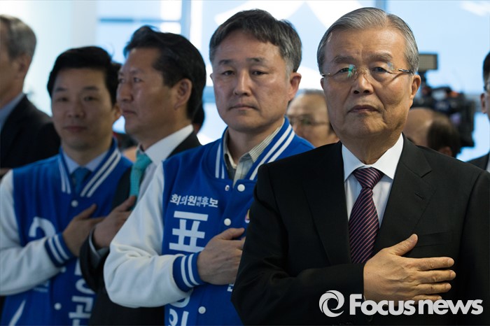 (용인=포커스뉴스) 김종인(오른쪽) 더불어민주당 비대위 대표가 25일 오후 경기도 용인시 표창원 후보 선거사무소 개소식에 참석해 표 후보 등 내빈들과 함께 국민의례 하고 있다. 오른쪽부터 김종인 대표, 표 후보, 정청래 의원, 김병관 경기 성남분당갑 후보.