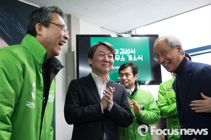 (서울=포커스뉴스) 안철수 국민의당 상임공동대표(가운데)가 25일 오후 서울 관악구 김성식 관악(갑) 예비후보 선거사무소 개소식에서 박수를 치고 있다. 오른쪽부터 윤여준 전 환경부장관, 안 대표, 김성식 후보