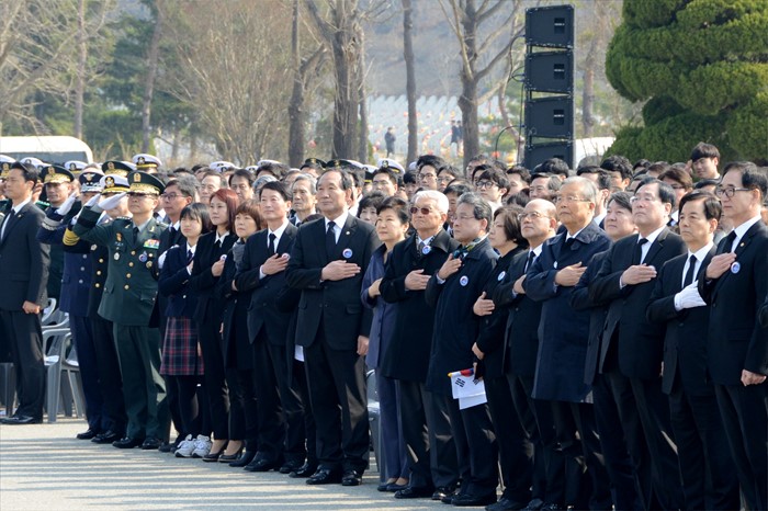 (대전=포커스뉴스) 박근혜 대통령이 25일 오전 대전 유성구 국립대전현충원에서 열린 제1회 서해수호의 날 기념식에 참석해 국기에 대한 경례를 하고 있다. <사진제공=국립대전현충원>