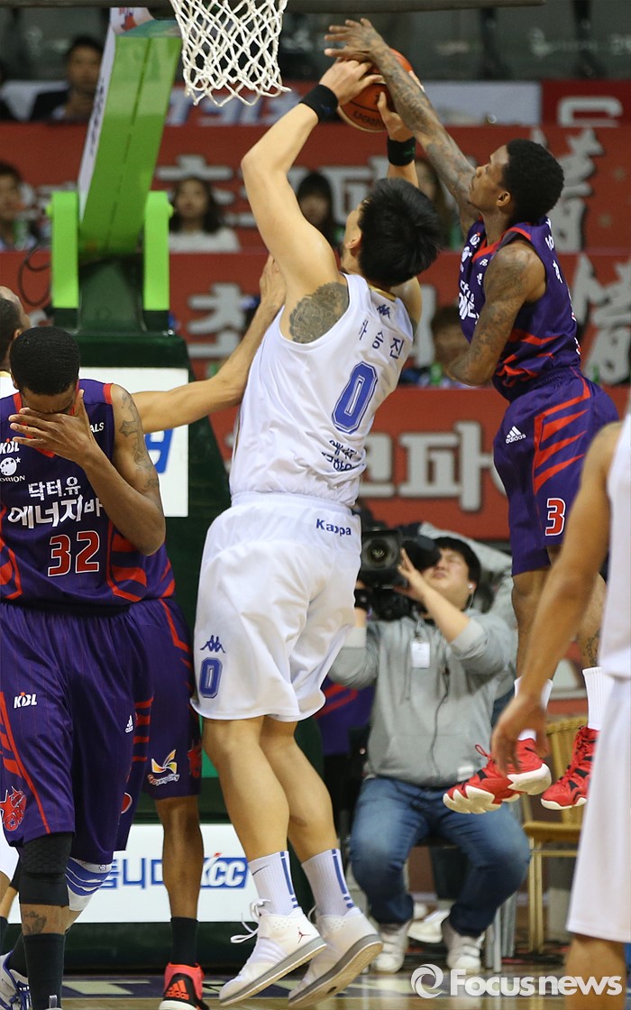 (고양=포커스뉴스) 25일 고양체육관에서 열린 2015-2016 프로농구 챔피언결정전 4차전 오리온-KCC경기에서 오리온 조 잭슨이 KCC 하승진의 슈팅을 뒤에서 저지하고 있다.