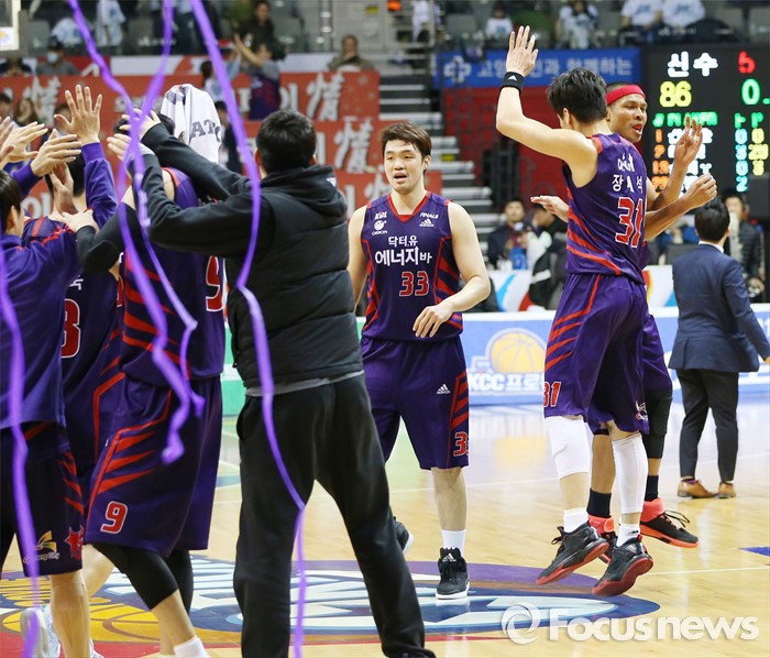 (고양=포커스뉴스) 25일 고양체육관에서 열린 2015-2016 프로농구 챔피언결정전 4차전 오리온-KCC경기에서 승리한 오리온 장재석과 문태종이 뛰어 오르며 몸을 부딪치는 세리모니를 하고 있다.