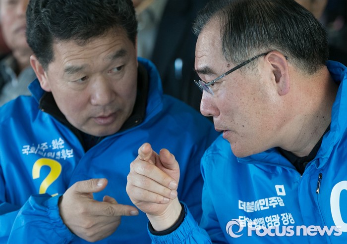 (무안=포커스뉴스) 26일 오후 전남 무안군에서 열린 서삼석 더불어민주당 전남 영암·무안·신안군 후보 선거사무소 개소식에 참석한 이개호(오른쪽), 신정훈 의원이 대화하고 있다.