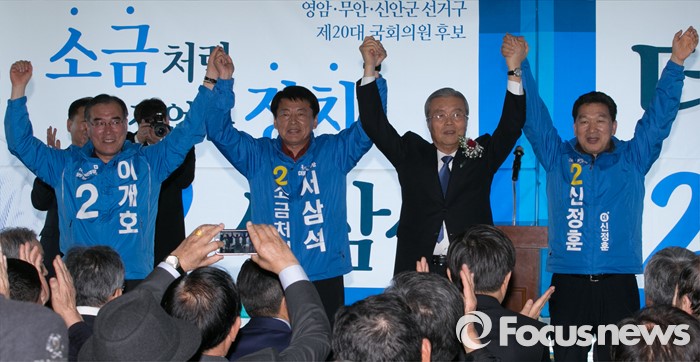 (무안=포커스뉴스) 26일 오후 전남 무안군에서 열린 서삼석 더불어민주당 전남 영암·무안·신안군 후보 선거사무소 개소식에 참석한 김종인 비대위 대표와 내빈들이 손을 들어 인사하고 있다. 왼쪽부터 이개호 의원, 서 후보, 김 대표, 신정훈 의원.