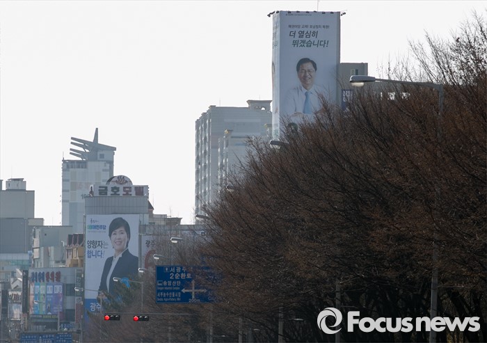 (광주=포커스뉴스) 야권의 호남쟁탈전이 벌어질 것으로 예상되는 20대 총선을 보름여 앞으로 다가온 26일 오후 광주 서구 풍금사거리에서 각 정당 후보들의 선거사무소 현수막이 보이고 있다.