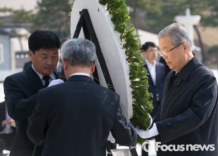 (광주=포커스뉴스) 김종인 더불어민주당 비대위 대표가 27일 오전 광주 북구 국립 5·18민주묘지를 방문해 헌화하고 있다.