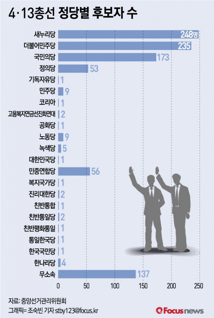 정당별로는 새누리당이 248명으로 가장 많은 후보자를 냈다.
