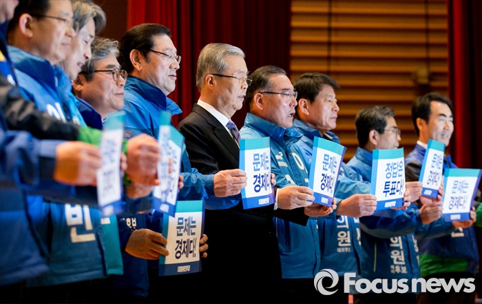 (광주=포커스뉴스) 김종인 더불어민주당 비대위 대표가 27일 오전 광주 서구 김대중컨벤션센터에서 열린 더불어민주당 경제살리기 광주·전남 20대 총선 후보자 연석회의에 참석해 후보자들과 피켓을 들고 퍼포먼스를 하고 있다.