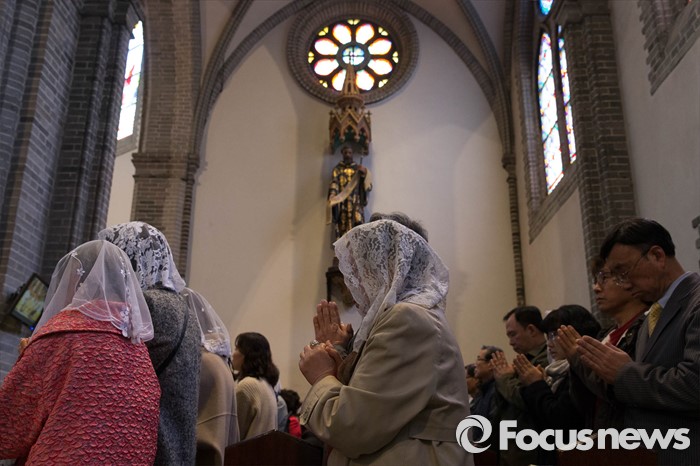 (서울=포커스뉴스) 부활절을 맞아 27일 정오 서울 중구 명동성당에서 열린 '예수 부활 대축일 미사'에 신도들이 참석해 기도하고 있다.
