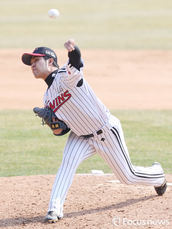 (서울=포커스뉴스) 27일 서울 잠실구장에서 열린 2016프로야구 시범경기 두산-LG 경기에서 LG 투수 최성훈이 투구하고 있다.