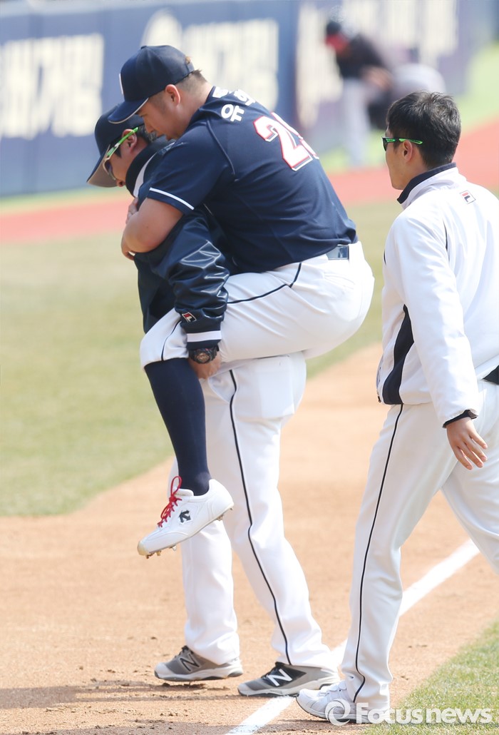 (서울=포커스뉴스) 27일 서울 잠실구장에서 열린 2016프로야구 시범경기 두산-LG 경기에서 5회말 LG 채은성의 타구에 왼쪽 정강이를 맞은 두산 투수 유희관이 통증을 호소하며 업혀 나가고 있다.