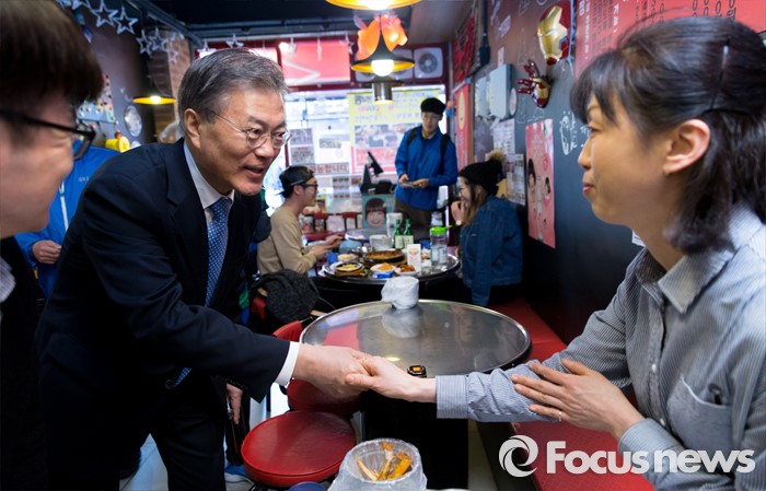 (성남=포커스뉴스) 27일 오후 경기 성남 중원구 모란오거리에서 문재인 더불어민주당 전 대표가 은수미 더민주 경기 성남중원 후보를 도와 거리인사를 하고 있다.