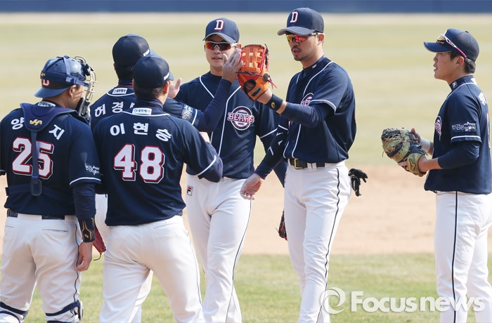 (서울=포커스뉴스) 27일 서울 잠실구장에서 열린 2016프로야구 시범경기 두산-LG 경기에서 LG를 물리친 두산 선수들이 마운드에 모여 승리를 자축하고 있다.