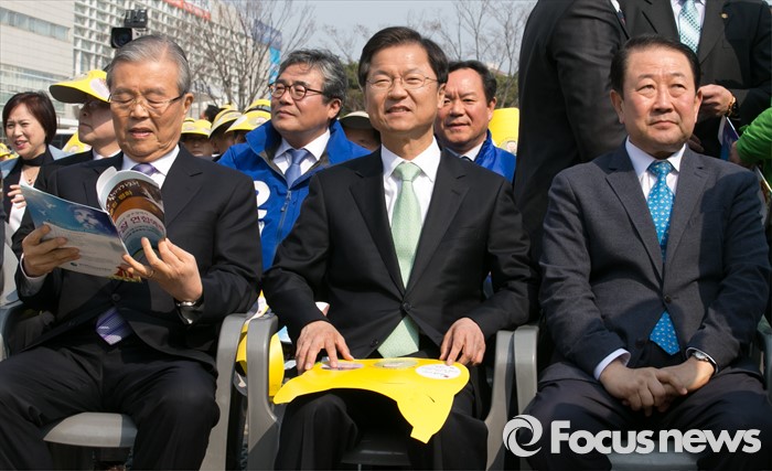 (광주=포커스뉴스) 김종인(왼쪽부터) 더불어민주당 비대위 대표, 천정배 국민의당 공동대표, 박주선 최고위원이 27일 오후 광주광역시청 문화광장에서 열린 2016 부활절 연합예배에 참석해 자리하고 있다.