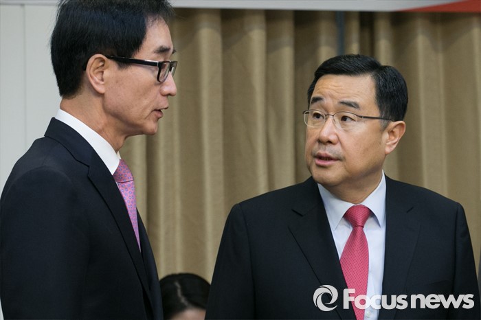 (서울=포커스뉴스) 김정훈(오른쪽) 새누리당 정책위의장과 이준식 사회부총리 겸 교육부 장관이 28일 오전 서울 여의도 국회에서 열린 누리과정 등 교육현안 관련 당정협의에 참석해 대화하고 있다.
