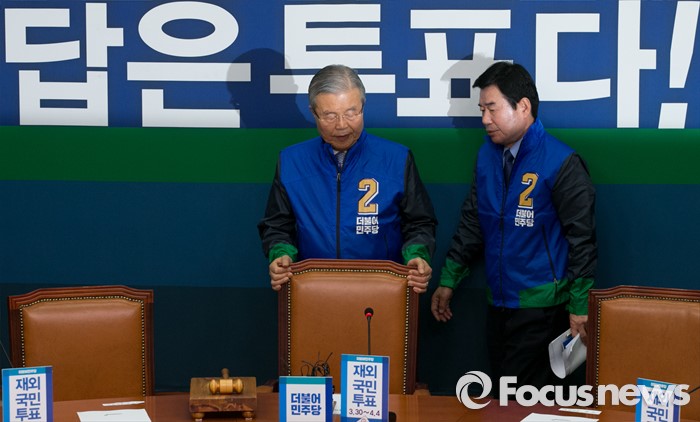 (서울=포커스뉴스) 김종인(왼쪽) 더불어민주당 비대위 대표 겸 선대위원장과 김진표 부위원장이 27일 오전 서울 여의도 국회에서 중앙선거대책위원장단회의에 참석하고 있다.
