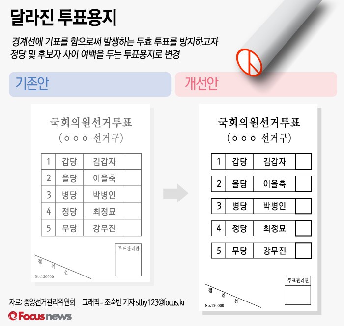 (서울=포커스뉴스) 경계선에 기표를 함으로써 발생하는 무효 투표를 방지하고자 오는 4월13일 '제 20대 국회의원선거'에서는 정당 및 후보자 사이 여백을 두는 투표용지로 변경된다.