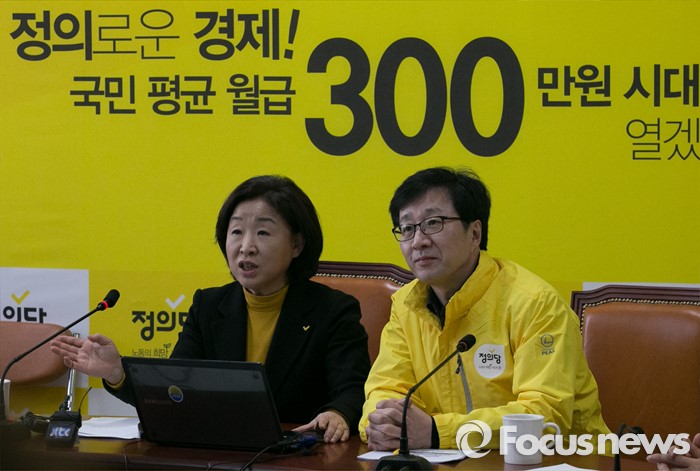 (서울=포커스뉴스) 심상정(왼쪽) 정의당 상임선대위원장과 천호선 공동선대위원장이 28일 오전 서울 여의도 국회에서 열린 중앙선대위 회의에 참석해 '정의로운 가계부' 소개 및 시연 행사를 하고 있다.