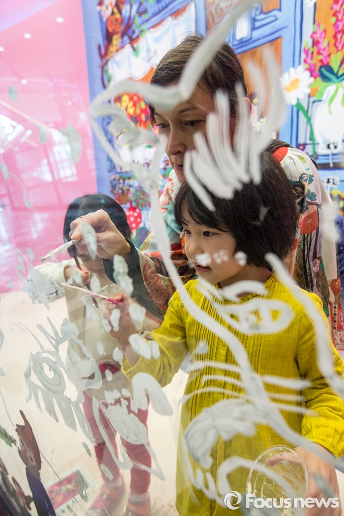 (서울=포커스뉴스) 28일 오전 서울 송파구 롯데백화점 잠실점 에비뉴엘 아트홀에서 열린 '러블리 레테' 전시회에서 프랑스 작가 나탈리 레테가 어린이들과 라이브페인팅을 하고 있다.
