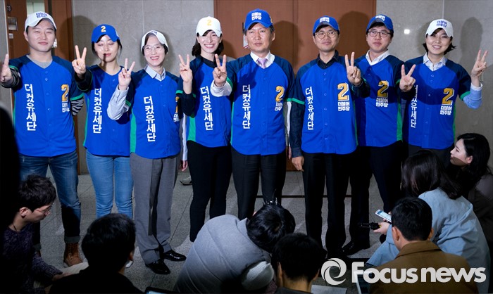 (서울=포커스뉴스) 더불어민주당에서 공천 탈락한 정청래, 김광진, 장하나 의원과 김빈 청년 비례대표 후보, 이동학 예비후보 등으로 구성된 '더컸유세단'이 28일 오전 서울 여의도 국회 정론관에서 출범 기자회견을 마친 뒤 취재진을 향해 기호 2번을 뜻하는 브이 포즈를 취하고 있다.