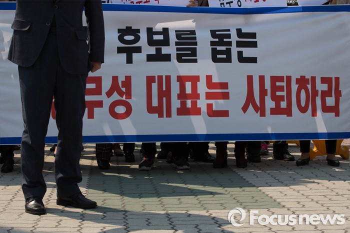 (서울=포커스뉴스) 28일 오후 서울 영등포구 국회 앞에서 대구 동구을 무공천 발표로 총선 출마가 좌절된 이재만 전 대구 동구청장의 지지자들이 김무성 새누리당 대표의 사퇴를 촉구하고 있다.