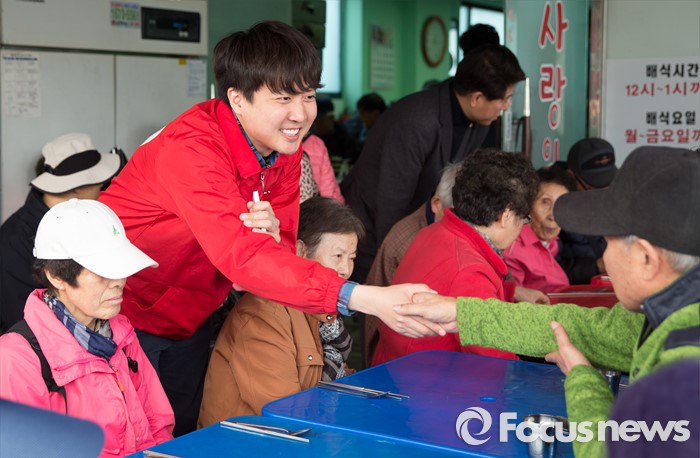 (서울=포커스뉴스) 이준석 새누리당 노원병 후보가 28일 오후 서울 노원구 당고개역 인근의 한 식당에서 선거 유세를 하고 있다.