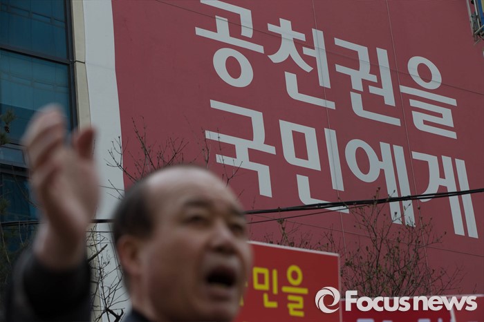 (서울=포커스뉴스) 28일 오후 서울 영등포구 새누리당 당사 앞에서 대구 동구을 무공천 발표로 총선 출마가 좌절된 이재만 전 대구 동구청장의 지지자들이 김무성 새누리당 대표의 사퇴를 촉구하고 있다.