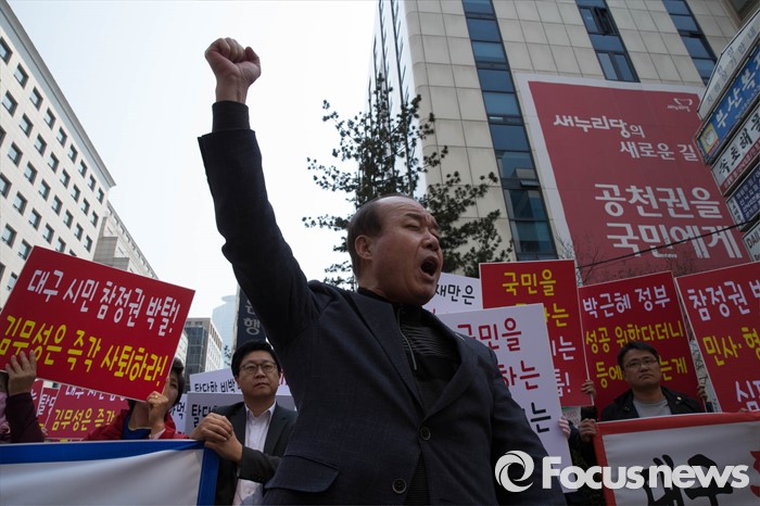 (서울=포커스뉴스) 28일 오후 서울 영등포구 새누리당 당사 앞에서 대구 동구을 무공천 발표로 총선 출마가 좌절된 이재만 전 대구 동구청장의 지지자들이 김무성 새누리당 대표의 사퇴를 촉구하고 있다.
