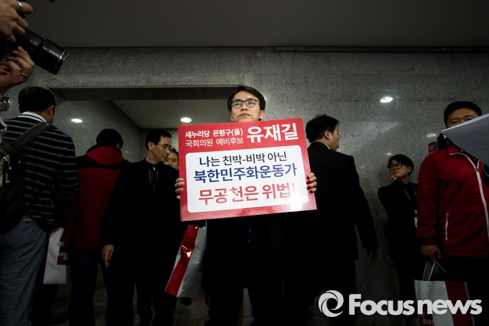 (서울=포커스뉴스) 새누리당의 무공천 결정으로 4.13 총선 서울 은평을 출마가 무산된 유재길 예비후보가 28일 오후 20대 총선 새누리당 공천자대회가 열리는 서울 영등포구 국회 의원회관에서 피켓 시위를 벌이고 있다.