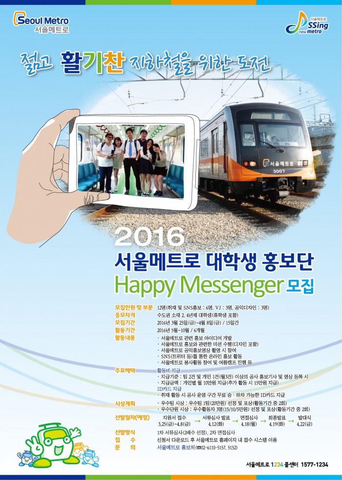 (서울=포커스뉴스) 서울메트로는 2016년 대학생 홍보단 '해피메신저'를 25일부터 다음달 8일까지 모집한다고 28일 밝혔다.
