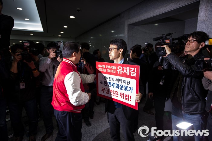 (서울=포커스뉴스) 새누리당의 무공천 결정으로 4.13 총선 서울 은평을 출마가 무산된 유재길 예비후보가 28일 오후 20대 총선 새누리당 공천자대회가 열리는 서울 영등포구 국회 의원회관에서 피켓 시위를 벌이고 있다.