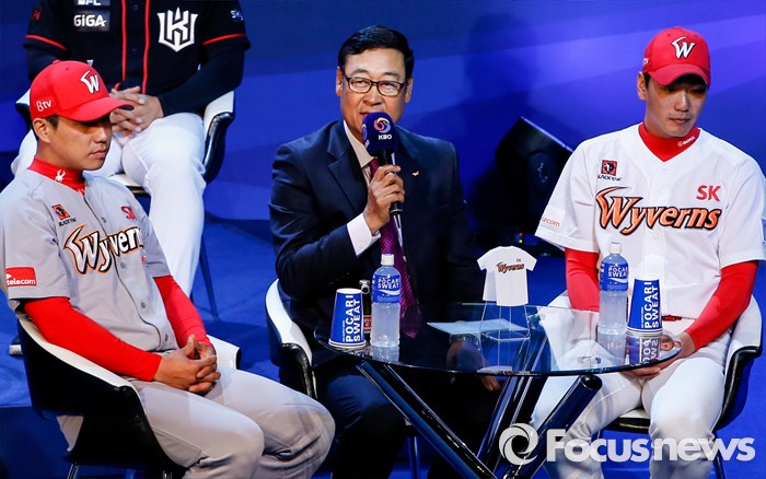 (서울=포커스뉴스) 28일 오후 서울 용산구 브루스퀘어 삼성카드홀에서 열린 '2016 타이어뱅크 프로야구 미디어데이 & 팬페스트' 행사에 참석한 SK 와이번스 김용희 감독이 새 시즌 출사표를 밝히고 있다.