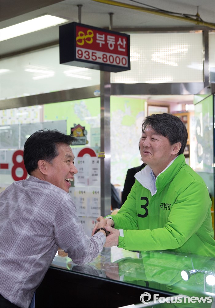 (서울=포커스뉴스) 20대 총선을 16일 앞둔 28일 오후 안철수 국민의당 서울 노원병 후보가 보람상가에서 상인들에게 인사하고 있다.