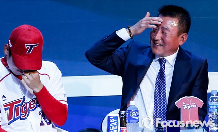 (서울=포커스뉴스) 28일 오후 서울 용산구 브루스퀘어 삼성카드홀에서 열린 '2016 타이어뱅크 프로야구 미디어데이 & 팬페스트' 행사에 참석한 기아 타이거즈 김기태 감독이 난처한 질문에 얼굴을 붉히고 있다.