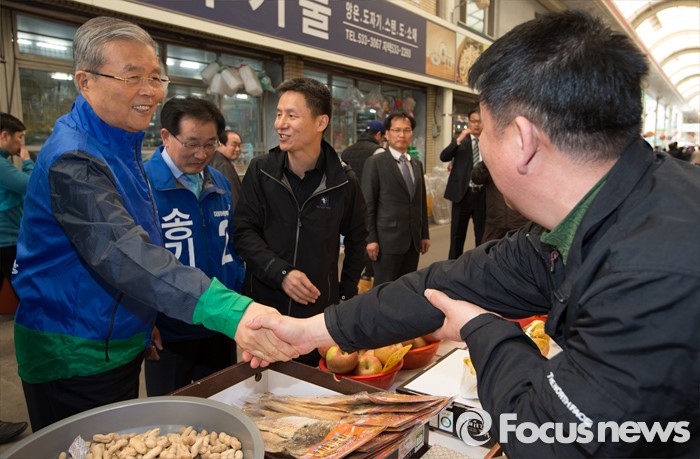 (진천=포커스뉴스) 김종인 더불어민주당 비상대책위 대표가 28일 오후 충북 진천군 중앙시장을 방문, 시민들과 인사를 하고 있다.