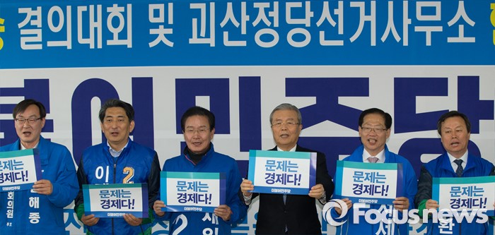 (괴산=포커스뉴스) 김종인 더불어민주당 비상대책위 대표가 28일 오후 충북 괴산군 정당선거사무소에서 열린 20대 총선 충북 후보 연석회의에서 충북지역 후보자들과 필승을 다짐하고 있다.