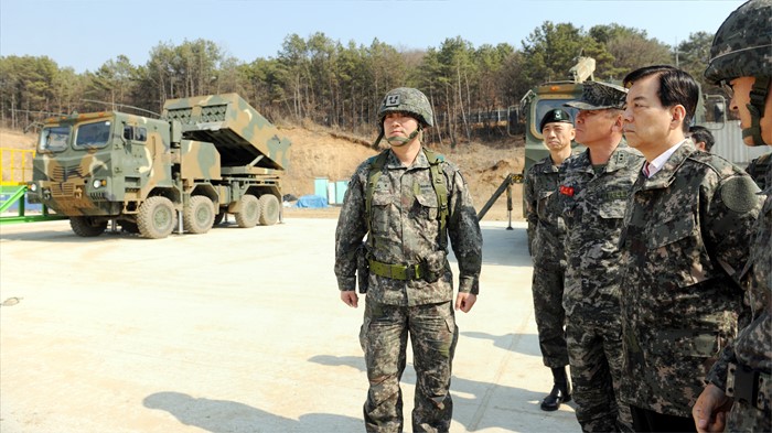 (서울=포커스뉴스) 한민구 국방부 장관이 28일 육군 최전방 부대를 방문, 다연장 로켓인 천무의 대비태세를 점검하고 있다. <사진제공=국방부>