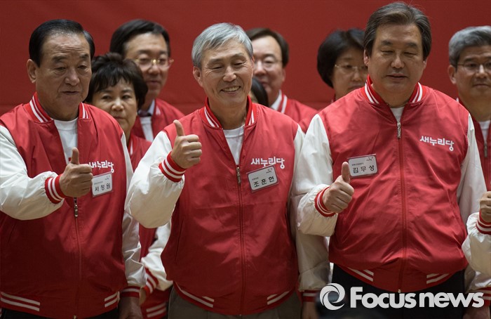 (서울=포커스뉴스) 28일 오후 서울 여의도 국회 의원회관에서 열린 새누리당 20대 총선 공천자대회에 참석한 지도부와 조훈현 비례대표 후보가 기념촬영을 하고 있다. 왼쪽부터 서청원 공동선대위원장, 조 후보, 김무성 공동선대위원장.